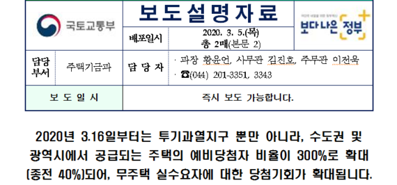 국토교통부(장관 김현미)는 최근 수도권의 비규제지역 및 광역시를 중심으로 무순위 청약*에 대한 관심과 신청이 높아지고 있는 청약시장을 감안하여, 예비당첨자 비율을 300%까지 확대(종전 40%)하는 등 무순위 청약을 개선(최소화)할 계획이라고 밝혔다.